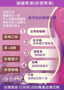 【食用方法】 主要功能為排宿便,以個人上廁所和習慣為主。如:早上如廁就睡前吃,晚上如廁就下午吃,吃完記得要多喝水,至少300-500CC,一天一條,症狀較嚴重者,可再加一條,多食無益,